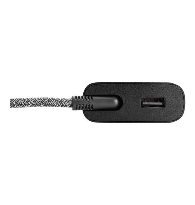 - Sluit de USB-C -kabel van de adapter aan op de USB-C -poort op uw notebook of tablet voor maximaal 60 W stroomvoorziening en sluit de USB-kabel van uw telefoon aan op de USB-A-poort voor 5 W vermogen of om op te laden en sluit de netvoedingskop aan op een stopcontact.