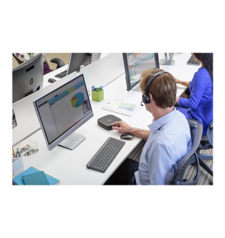 Voer een gesprek tot 30 meter vanaf uw bureau of telefoon met de HP UC draadloze duo hoofdtelefoon en beschik ook in de drukste omgevingen over een uitstekend stereogeluid en ruisonderdrukking met een ontwerp dat de hele werkdag comfortabel draagbaar is.- Beantwoord en beëindig gesprekken, demp en stel het volume in met één druk op de knop. Een indicatielampje waarschuwt anderen om uw gesprek niet te onderbreken. Dankzij de lange batterijlevensduur kunt u blijven werken.